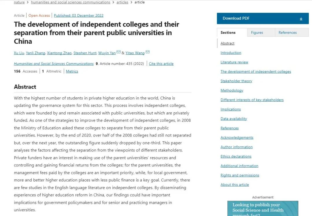12月3日,beat365科研处处长严五胤副研究员以通讯作者身份在Nature子刊Humanities and Social Sciences Communications(人文与社会科学通讯)发表研究论文,论文题目为The development of independent colleges and their ...