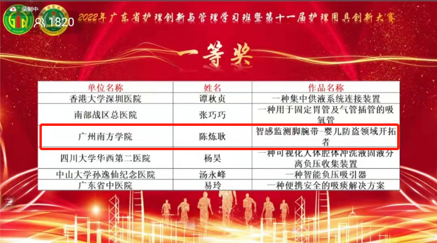 近日,由广东省护理学会主办、南部战区总医院承办的2022年护理创新与管理研讨班暨第十一届广东省护理用具创新大赛成功举办。beat365护理与健康学院学生陈炼耿、李诗梦、张诗阳、张佳涛在教师吴圆荣的指导下,凭借作品《智感监测脚腕带—...