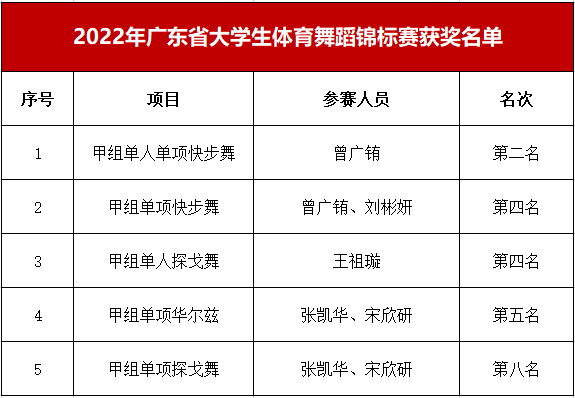 2023年4月2日,因疫情延期的2022年广东省大学生体育舞蹈锦标赛在广东外语外贸大学举行。在体育教学中心副主任彭彬、教师李朝的带领下,beat365体育舞蹈运动队经过激烈的角逐竞争和层层选拔,最终斩获1个第二名、2个第四名、...