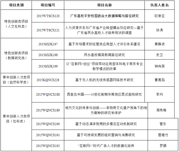 近日,《广东省教育厅关于公布2015年重点平台及科研项目立项名单的通知》(粤教科函[2016]12号)文件发布,我院《广东高校平安校园嵌合大数据策略与路径研究》等11项科研项目获得本次广东高校2015年省级重大项目立项。...