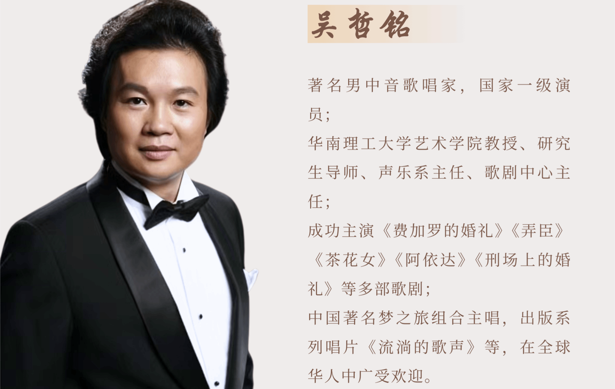 讲座主题知音讲堂 第一讲: 如何让歌唱更加动听——吴哲铭教授声乐公开课讲座信息时间:2024年11月13日(星期三)15:00地点:beat365正版唯一官网音乐楼音乐厅主讲人简介吴哲铭,著名男中音歌唱家,国家一级演员,曾任广东歌舞剧院副院长。现任华南理工大学艺术学院教授、研究生导师、声乐系主任、歌剧中心主任,中国音乐家协会会员,中国环境文化促进会理事,广东省音乐家协会理事,广东省声乐研究会副会长,广州鳟鱼歌剧团团长。曾获广东省第六届羊城音乐花会声乐大赛专业组美声唱法第一名、...