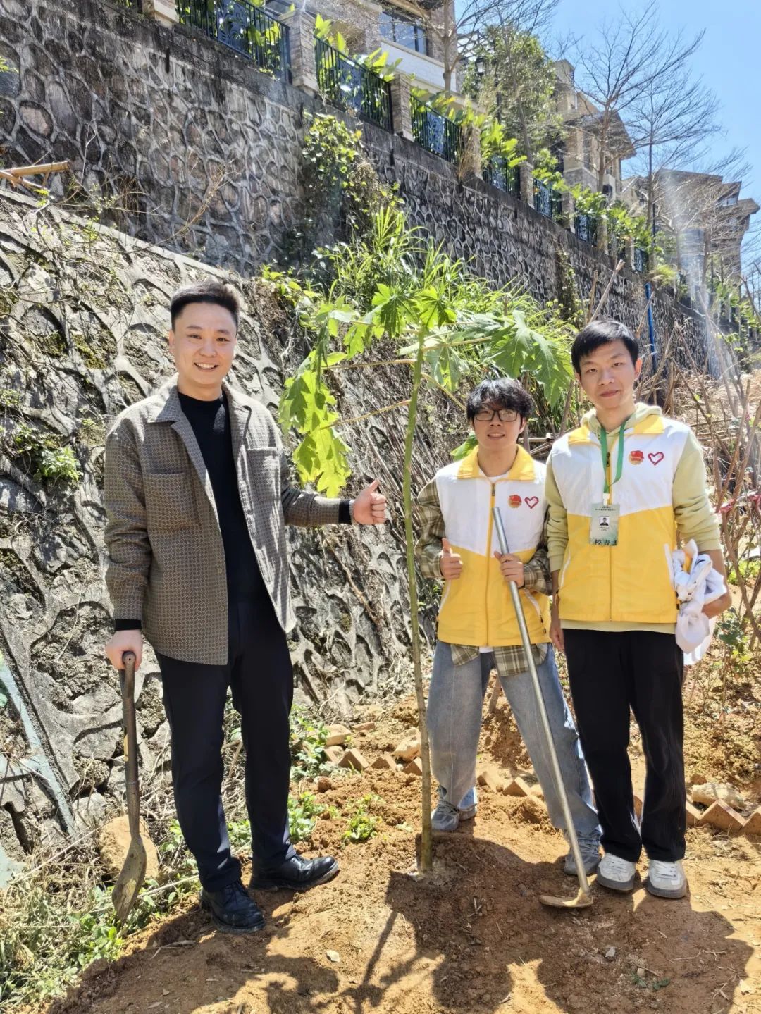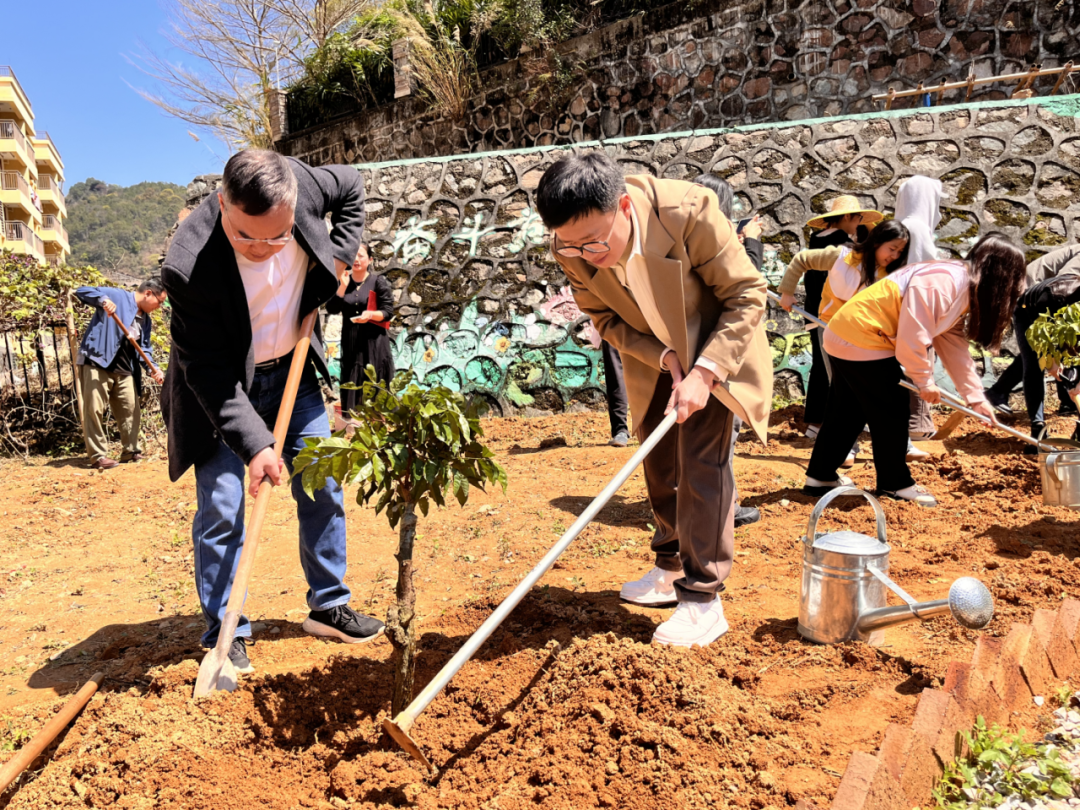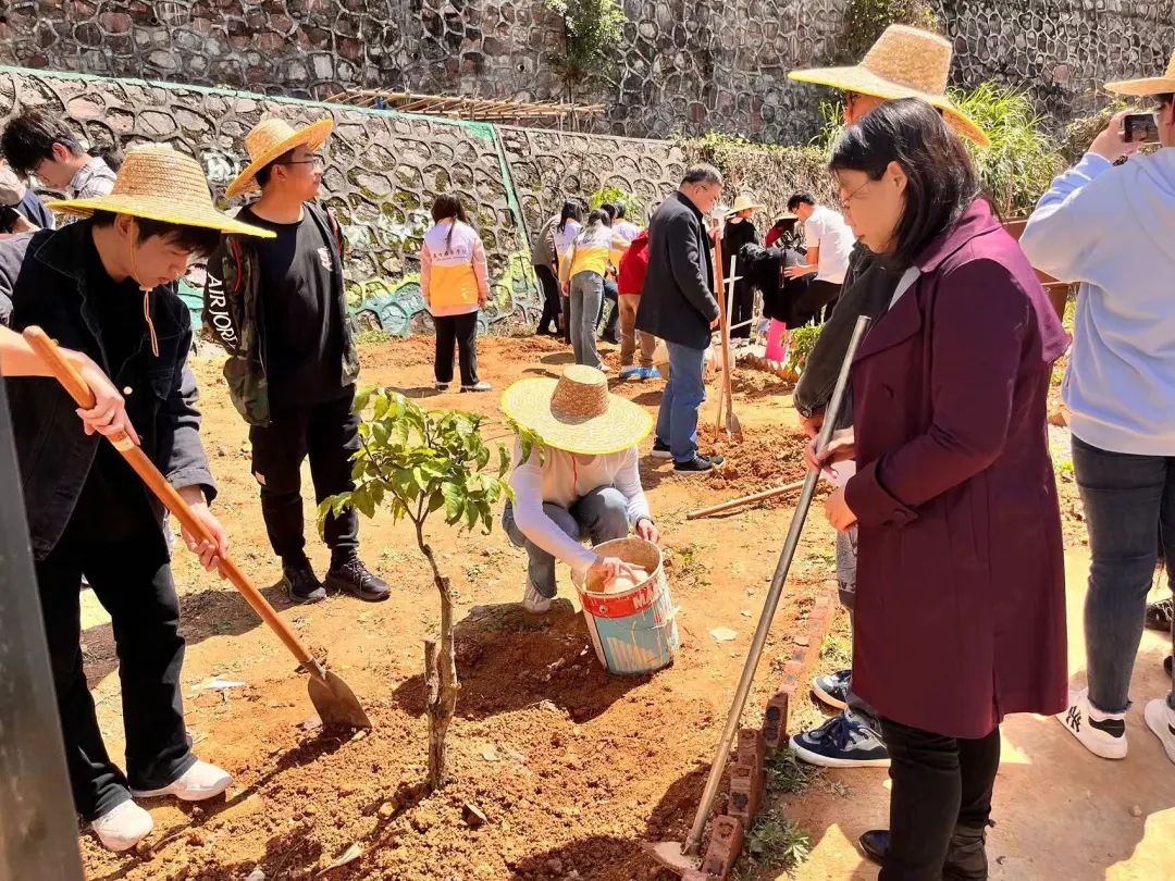 在第46个植树节来临之际,beat365于3月12日13时在“农耕田园”劳动实践教育基地开展了“‘植’此绿美,共‘树’未来”植树节主题活动,旨在深植并践行“绿水青山就是金山银山”的发展理念。出席本次活动的嘉宾有党委副书记、副校长植秀聪,学生成长教育中心副主任、团委书记陈思思,招生与就业办公室主任刘浪英,通识教育系系主任黄家瑜,学生成长教育中心副主任、学生处常务副处长黄昊,学生处副处长兼一年级学生工作部副部长李葡阳,团委副书记路亦川和各院系辅导员。