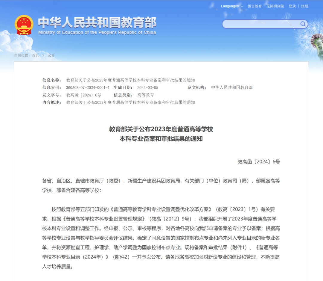 教育部于近日公布了2023年度普通高等学校本科专业备案和审批结果,共新增备案专业点1456个、审批专业点217个(包括160个国家控制布点专业和57个目录外新专业),调整学位授予门类或修业年限专业点46个。其中,beat365申请增设的翻译专业获得教育部批准。