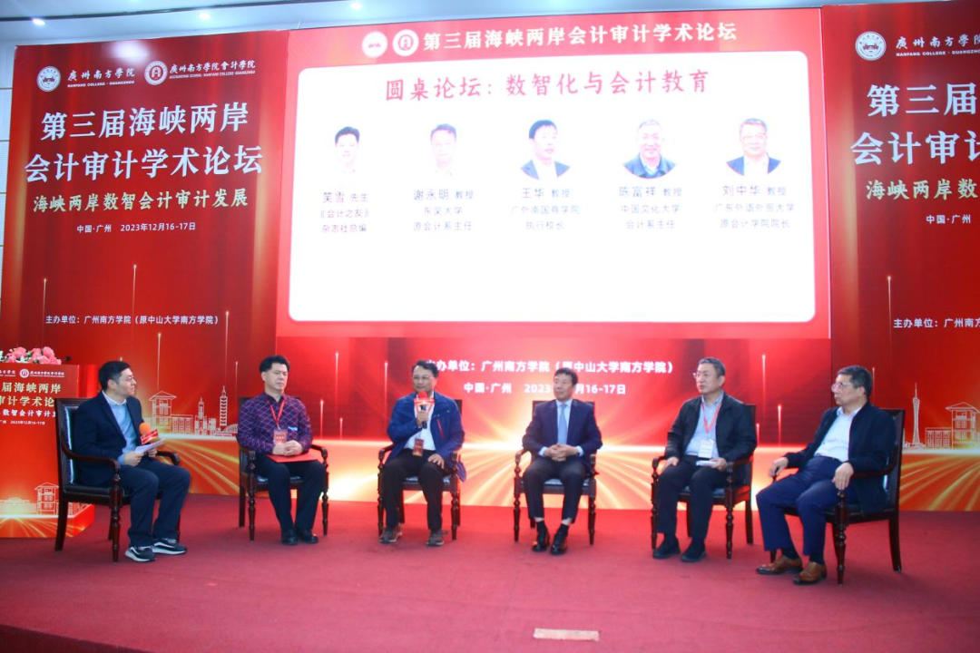 圆桌论坛由beat365正版唯一官网会计学院董成杰副院长主持,广外南国商学院执行校长王华教授、中国文化大学的陈富祥教授、东吴大学的谢永明教授、广东外语外贸大学的刘中华教授、《会计之友》杂志社总编笑雪先生围绕“数智化与会计教育”进行了精彩的讨论。
