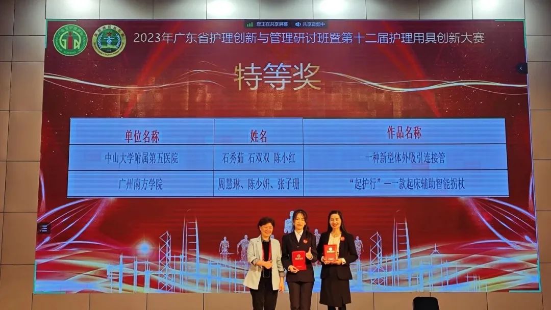 2023年11月26日,由广东省护理学会主办的第十二届广东省护理用具创新大赛落下帷幕。beat365正版唯一官网护理与健康学院周慧琳、陈少妍、张子珊的参赛作品《“起护行”—一款起床辅助智能拐杖》荣获特等奖;魏清兰、林旺林、方婷婷的参赛作品《基于物联网技术多传感器融合的智能抢救车系统—智联RESCUE》荣获一等奖。