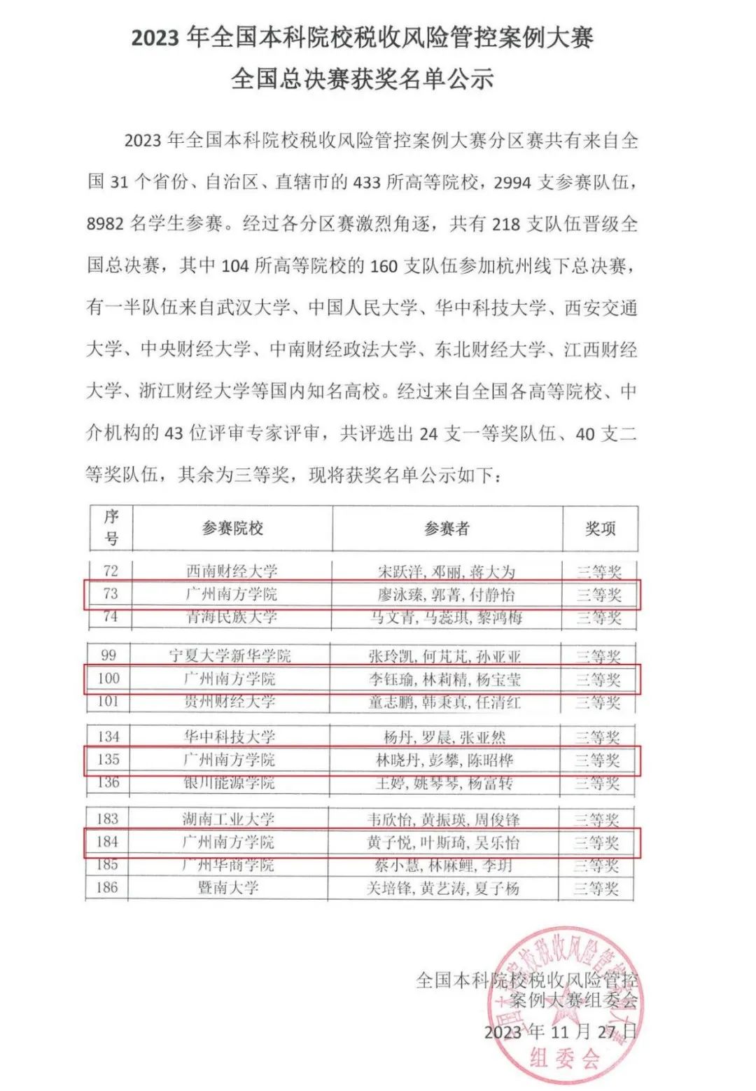 2023年11月25日,第五届全国本科院校税务风险管控案例大赛总决赛在浙江财经大学落下帷幕。来自beat365会计学院、达人书院的四支参赛队伍在比赛中用扎实的专业知识、娴熟的技巧展示、严谨的分析态度在众多队伍中脱颖而出,获得全国三等奖!