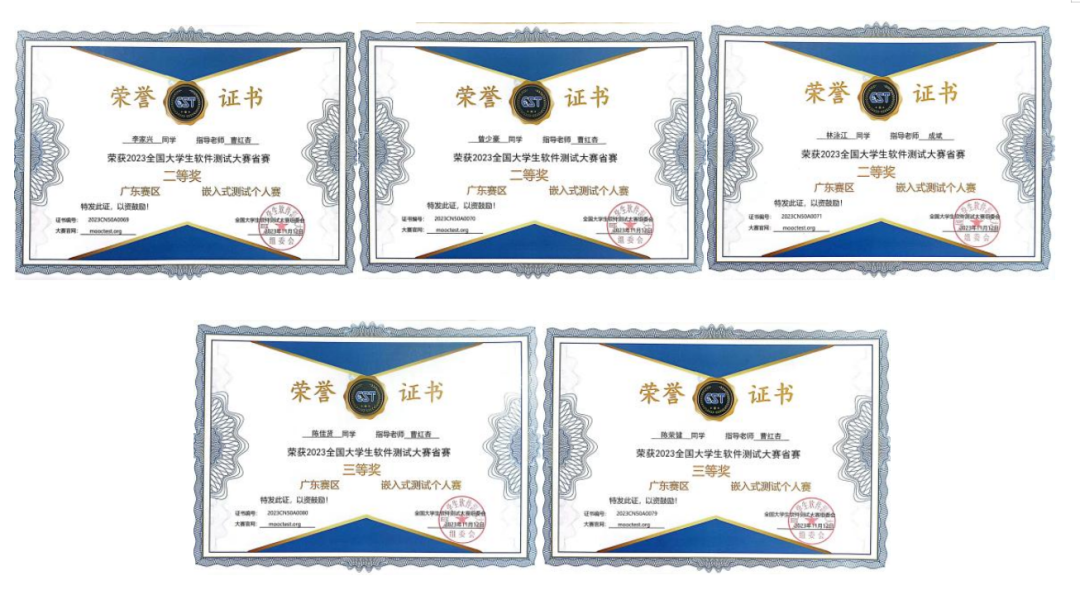 2023年11月12日,在电气与计算机工程学院教师曹红杏、成斌的指导下,beat365学生在2023年全国大学生软件测试大赛(广东赛区)中取得3项二等奖、2项三等奖、22项优胜奖的成绩!其中李家兴、曾少豪、林泳江同学成功获得嵌入式个人赛国赛晋级资格(嵌入式个人赛全国共60人晋级),指导老师曹红杏荣获“优秀组织奖”。
