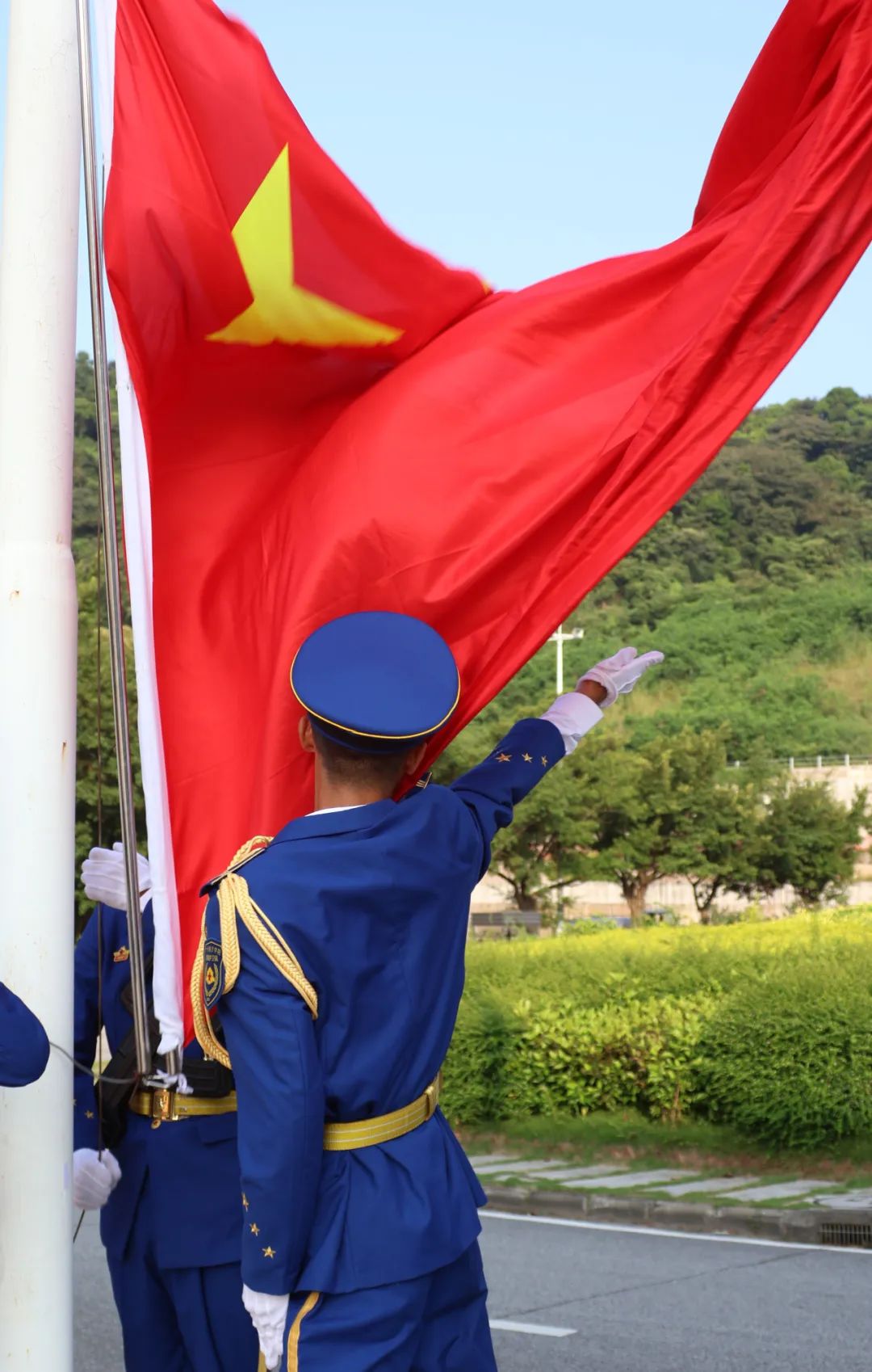 上午8时许,升旗仪式正式开始。学校国教队国旗班的成员迈着铿锵整齐的步伐,庄严地护卫着鲜艳的五星红旗走向升旗台。国歌奏响,五星红旗冉冉升起,全体人员面向国旗行注目礼、高唱国歌。