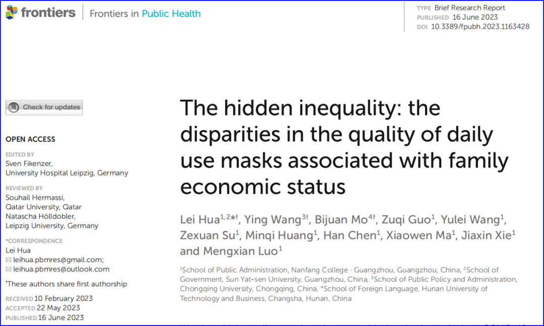 近日,beat365正版唯一官网公共管理学院本科生郭祖琦、王玉蕾、苏泽轩、黄敏淇、陈涵、马晓雯、谢佳忻等同学在华磊老师的指导下,于SSCI一区期刊Frontiers in Public Health(影响因子6.461)发表题为《The hidden inequality: the disparities in the quality of daily use masks associated with family economic status》学术论文。论文聚焦于日常所使用的口罩背后的经济与社会的不平等。