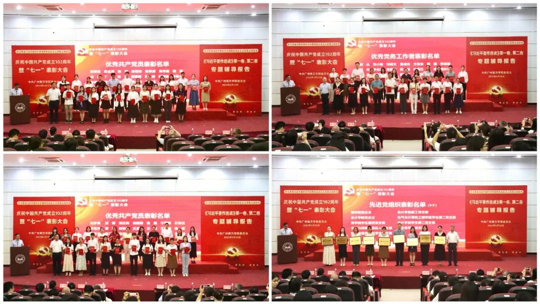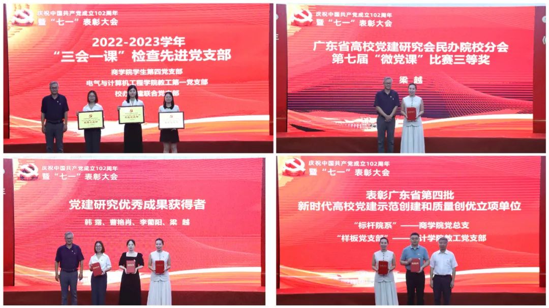 大会在雄壮的国歌声中拉开序幕。学校副校长夏亮辉宣读“七一”表彰决定,对陈楚言等47名优秀共产党员、蔡丛等25名优秀党务工作者、商学院党总支等9个先进党组织、商学院学生第四党支部等3个“三会一课”检查先进党支部、韩露等4名党建研究优秀成果获得者、“微党课”比赛三等奖获得者梁越、商学院党总支等2个广东省第四批新时代高校党建示范创建与质量创优立项单位进行表彰,获奖代表依次上台领奖。