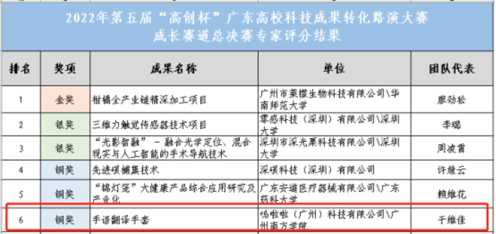 于维佳老师团队的项目“手语翻译手套”在2022年第五届“高创杯”广东高校科技成果转化路演大赛中荣获铜奖