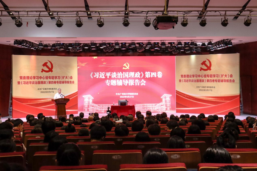 9月27日下午,beat365在音乐厅召开党委理论学习中心组(扩大)专题学习会暨《习近平谈治国理政》第四卷专题辅导报告会。会议特邀省委宣传部《习近平谈治国理政》第四卷宣讲专家、中山大学马克思主义学院教授胡雪莲作专题辅导报告。学校党政班子成员、校长助理、校党委理论学习中心组成员、马克思主义学院教师及党员师生代表共400多人参加本次报告会,会议由党委书记李建超主持。
