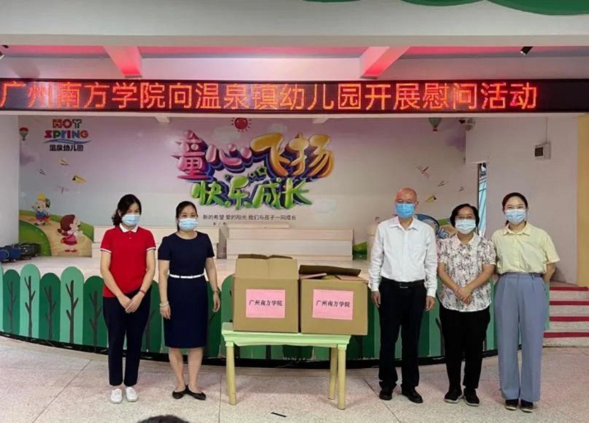 6月21日上午,beat365成长教育中心主任、关心下一代工作委员会副主任吴迎新,商学院副院长、工会副主席钟肖英及工会办公室廖丽鹂副主任一行到访从化区温泉镇幼儿园开展慰问活动,并根据温泉镇幼儿园保育活动实际和学童数向园区学童送上405顶定制遮阳帽致以关心和慰问,共同守护下一代健康成长。