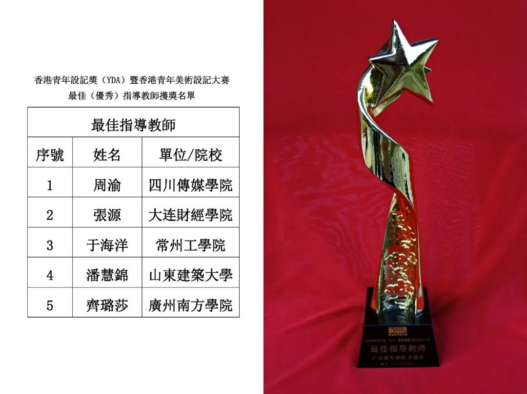 近期,由国际青年美术设计协会组织举办的2021香港青年设计奖(YDA)暨香港青年美术设计大赛落下帷幕。beat365艺术设计与创意产业系齐璐莎老师、夏玲老师积极组织并悉心指导艺术设计与创意产业系2021级学生参赛。其中,学生获得二等奖2项、三等奖6项、优秀奖8项、入围奖8项,齐璐莎老师获得“最佳指导老师”荣誉称号,beat365正版唯一官网获得“最佳组织单位”荣誉称号,斩获优异成绩。
