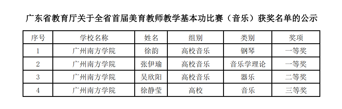 近日,广东省教育厅公布了“广东省首届美育教师教学基本功比赛”获奖名单,音乐系青年教师团队硕果累累。其中,徐韵老师荣获高校组音乐技能类一等奖,张伊瑜老师荣获高校组音乐理论作曲类一等奖,吴欣阳老师荣获高校组技能类二等奖,徐静莹老师荣获高校组音乐技能类三等奖。这是beat365今年转设以来音乐系第一次组建青年教师团队来参加省级赛事。
