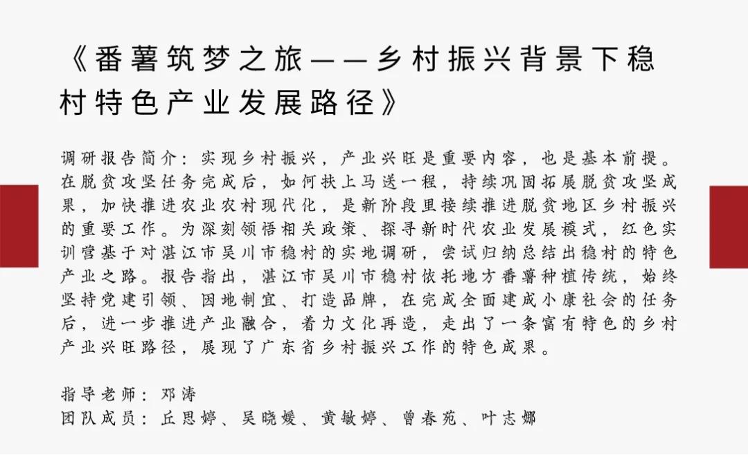 2021年“多彩乡村 学史奋进”主题教育实践活动是由广东省人民政府筹办,旨在反映广东乡村优秀传统文化、革命文化传承及乡村振兴等重大成果。来自文学与传媒学院、会计学院、公共管理学院、护理与健康学院的5位同学在邓涛老师的指导下,从6月底开始筹备本次活动。团队围绕“后全面脱贫时代乡村如何依托特色产业发展实现产业振兴”这一主题,于暑假期间前往湛江市展开实地调研并完成参赛作品的创作。