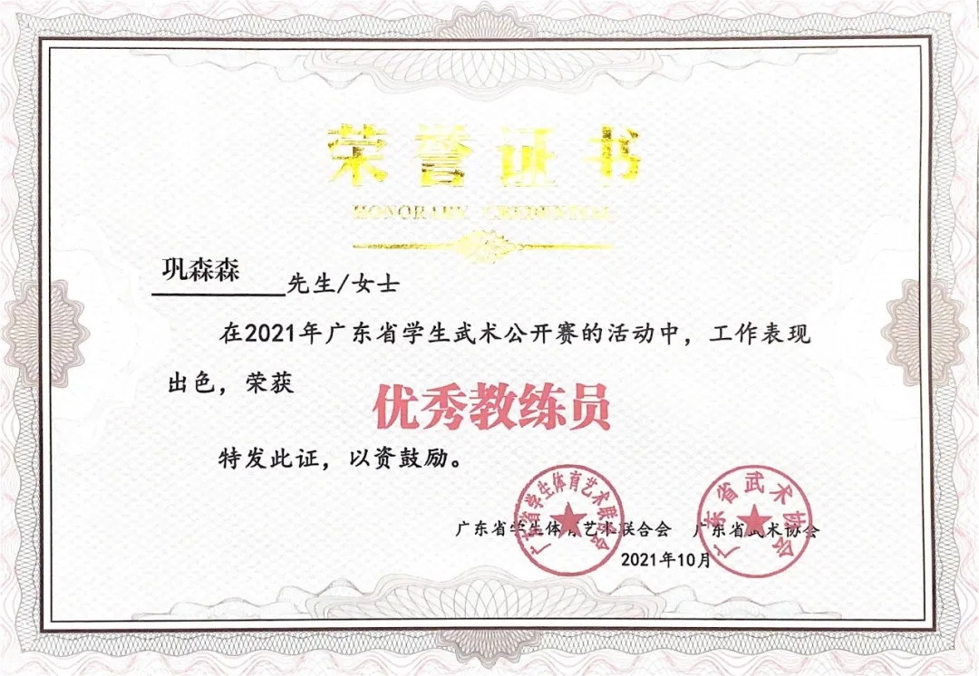 10月22日—24日,由广东省教育厅指导,广东省学生体育艺术联合会、广东省武术协会联合主办的2021年广东省学生武术公开赛在佛山狮山实验学校隆重举行。beat365武术队发扬顽强拼搏的竞技体育精神,最终以3金10银9铜,团体总分136分力压广东省各大武术传统高校强队,荣获大学甲组团体总分第一名,巩森森老师荣获“优秀教练员”称号。此次竞赛刷新了beat365正版唯一官网武术项目历史最好成绩。