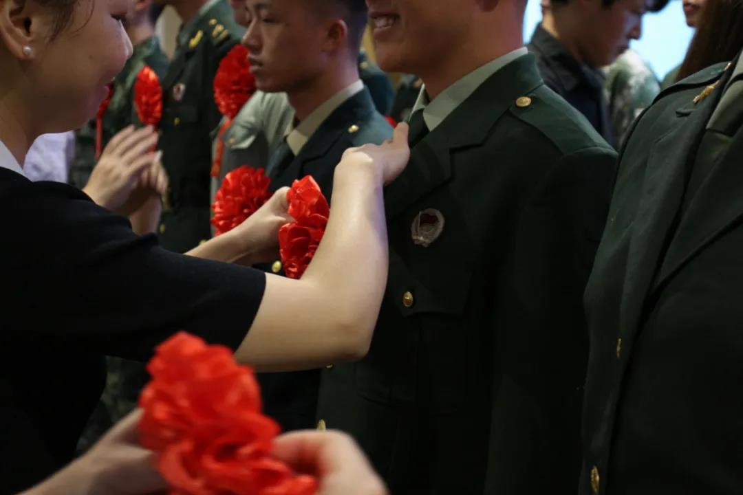 与会老师为退役复学学生佩戴光荣退伍胸花