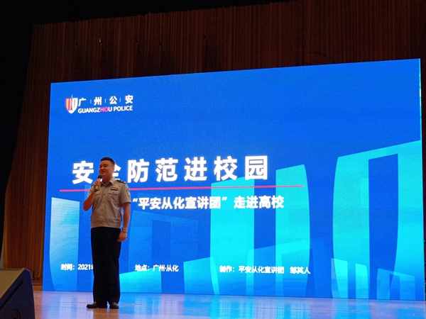为践行党史学习教育办实事要求,切实做好校园预防电信网络诈骗工作,守护师生个人财产安全,2021年9月15日,学校保卫处、学生处、一年级工作部与从化区公安分局联合开展了2021级新生安全宣讲工作。广州市公安局从化区分局安全宣讲团、温泉派出所、保卫处、学生处、一年级工作部相关老师和5000余名2021级新生参加了宣讲。
