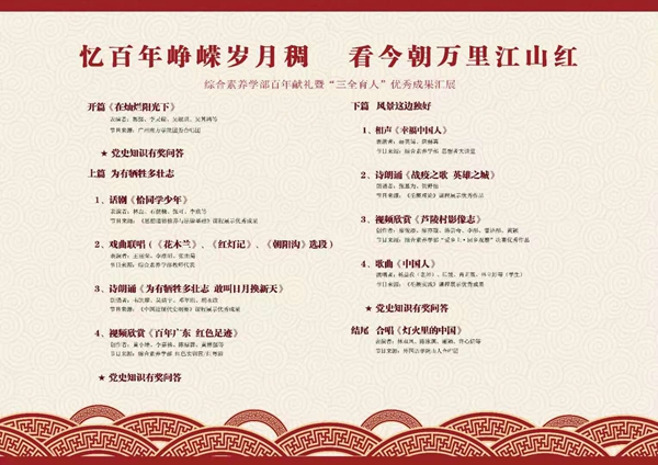 “忆百年峥嵘岁月稠,看今朝万里江山红”以富有诗情画意、对仗工整的联句高度概括了本次活动鲜明的红色主题,整台节目依循中国共产党百年历史的关键节点进行谋篇布局,分为“开篇”“上篇”“下篇”“尾声”四个部分,以宏大叙事而又细致入微的创作风格立体勾勒出中国共产党领导中华民族从站起来、富起来到强起来,上下百年波澜壮阔的历史画卷,内容跌宕起伏,画面多姿多彩。
