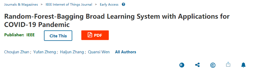 阳春三月,喜讯传来:电气与计算机工程学院2018级学生郑煜钒在国际期刊《IEEE Internet of Things Journal》发表题为《Random-Forest-Bagging Broad Learning System with Applications for COVID-19 Pandemic》的学术论文(第二作者),指导老师是电气学院特聘教授詹俦军博士。