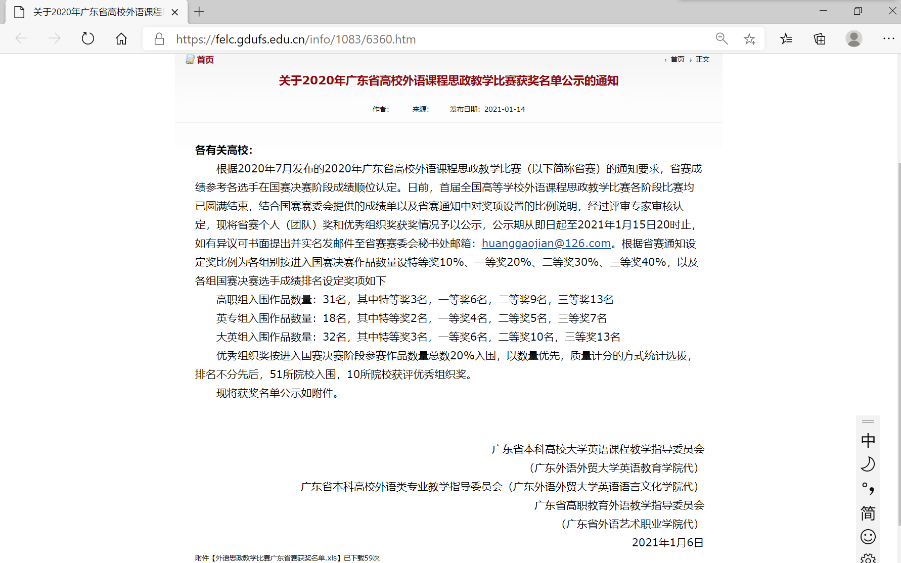2021年1月14日,“2020年广东省高校外语课程思政教学比赛”圆满结束,中山大学南方学院大学英语教学中心教师黄蔚、邓雅倩获得本科大学英语组一等奖。