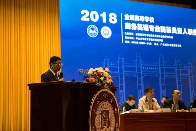 北京外国语大学校长助理王文斌教授在主旨发言中提出了中国外语教育改革的许多新思路,并谈到了构建中国外语教育学的新构想。教育部高等学校商务英语专业教学协作组组长、对外经济贸易大学王立非教授就商务英语专业国家标准的解读与落实提出了许多十分专业的、指导性的建议。中山大学外国语学院教授、博士生导师、中山大学南方学院外国语学院院长丁建新教授介绍了应用型学科建设的许多成功经验,并强调在应用型转向中不忘博雅、全人教育的思想。他指出商务英语专业作为一个知识体系应推进跨学科的学术研究。