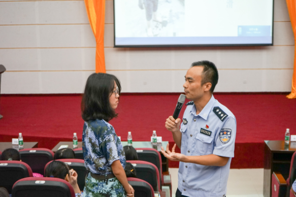 在互动环节,同学们提出了许多自己感兴趣的安全话题,比如“什么是正当防卫”、“女生夜行如何保护自己”、“家中老人如何防范保健品骗局”、“面对行凶歹徒怎么办”等,熊春林警官为大家详细、全面地介绍了相关知识,并提出了遇到各类安全问题时的注意事项。在座师生听得津津有味,纷纷表示在这次安全宣讲中受益匪浅。