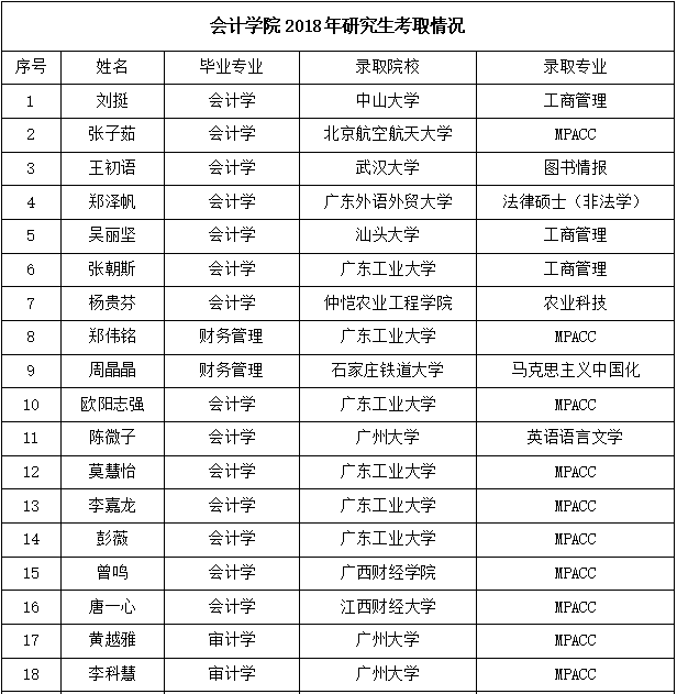 在2018年研究生招生考试中,会计学院学生再创佳绩,其中张子茹等19名同学被中山大学、武汉大学、北京航空航天大学、汕头大学、广东外语外贸大学、江西财经大学等国内知名高校录取,将进入更高层次的深造。