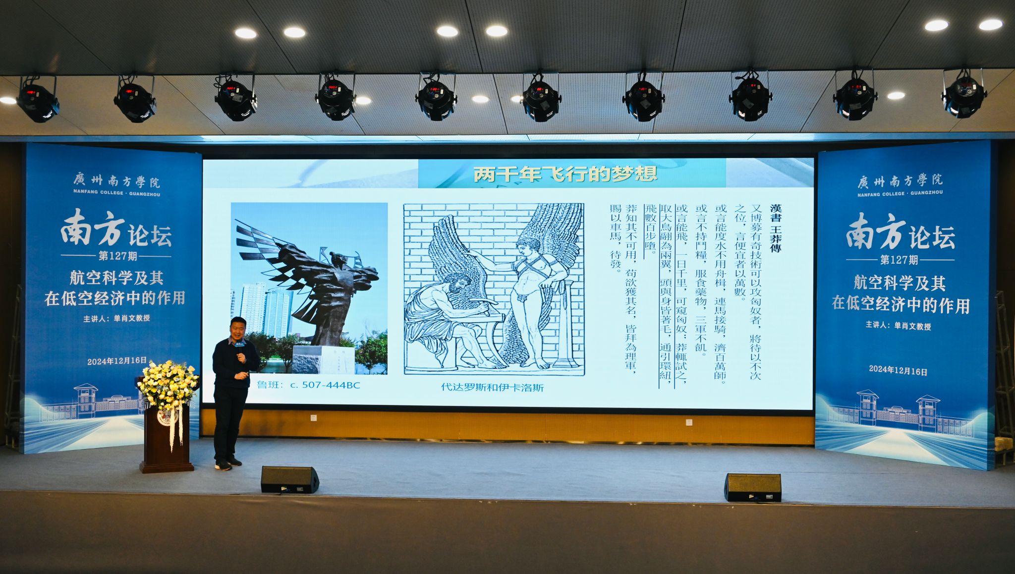 “嫦娥奔月,逐梦九天,人类飞行梦想是怎样一步步实现的?”单肖文教授从古代人类的飞行梦切入,讲述航天科技历经两千多年的演变——从中外飞天神话传说到现代物理学的创立、再到航天科技的实现。