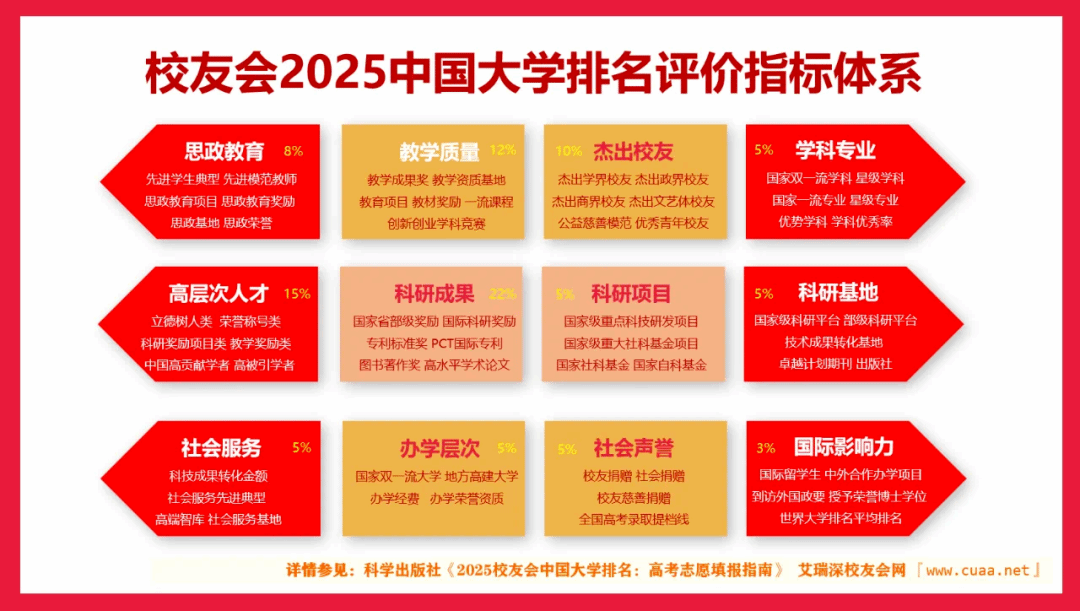 据悉,校友会中国大学排名首发于2003年,至今已有23年的历史,已成为具有广泛社会影响力、公信力、参考价值和创新力的中国大学排名领先品牌。校友会2025年中国大学排名评价指标体系由办学层次、思政教育、教学质量、杰出校友、高层次人才、学科专业、科研项目、科研基地、科研成果、社会服务、社会声誉和国际影响力12个一级指标构成,基于“大平台、大团队、大项目、大成果、大校友”体系框架展开系统评价,覆盖的评估指标高达900多项。