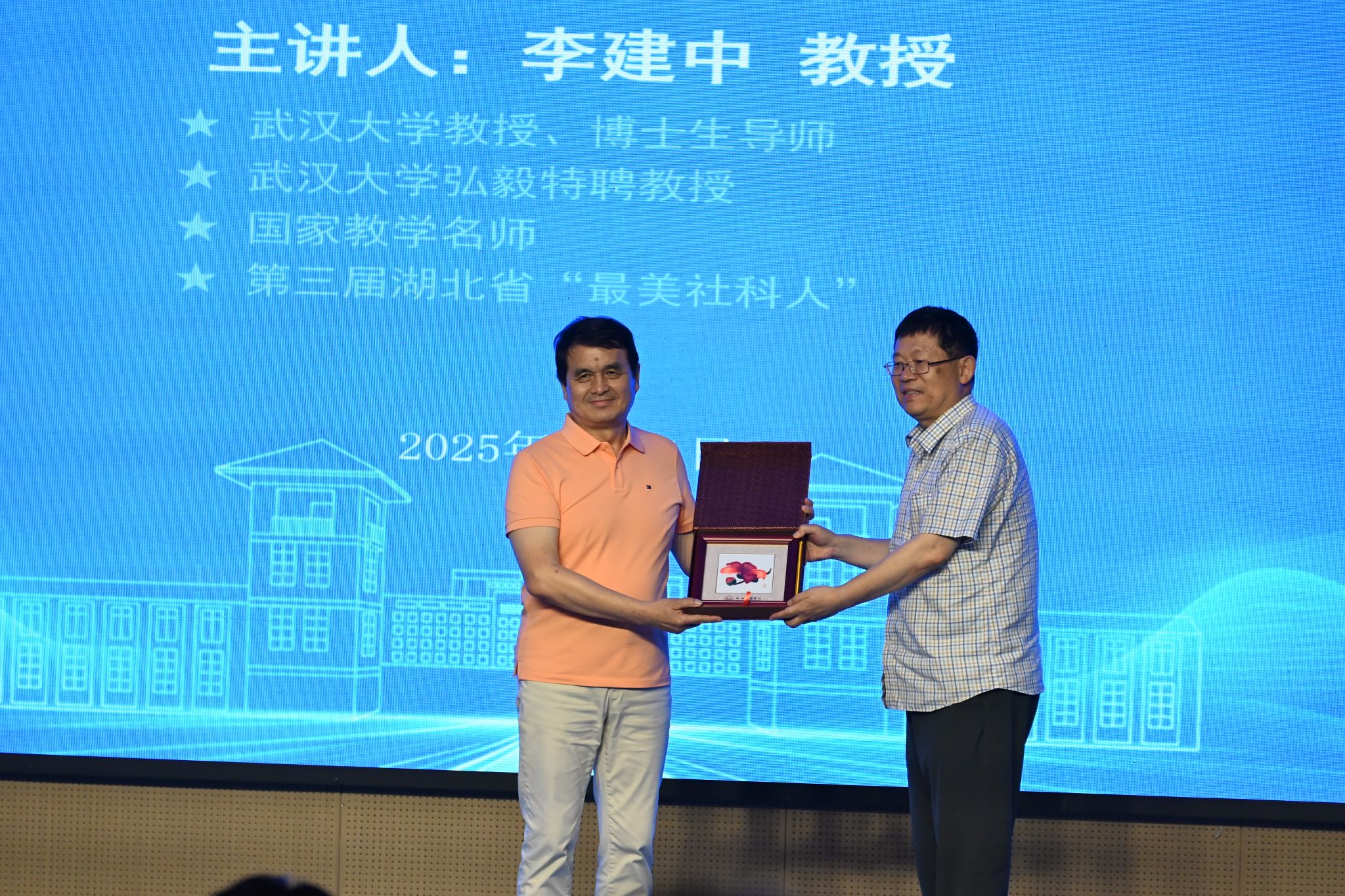 讲座尾声,刘文斌副校长代表学校向李建中教授赠送纪念品广绣《荔枝》。