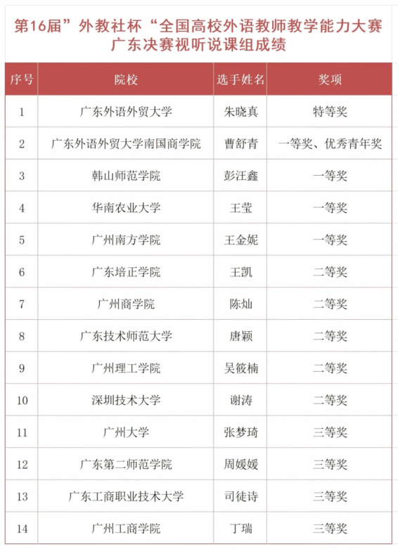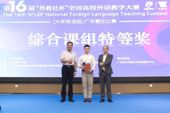 随后,与会嘉宾为获奖选手颁奖。广州大学杨之淼老师和广东外语外贸大学朱晓真老师分别获得综合课组与视听说课组特等奖,将代表广东赛区出征全国总决赛。beat365正版唯一官网王金妮老师凭借在出色的课堂互动与思政元素融合设计,获得视听说课组一等奖,宋微微老师荣获综合课组二等奖。