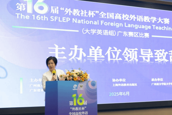 广东省本科高校大学英语课程教学指导委员会秘书长陈金诗教授代表主办单位致辞。陈秘书长首先向获奖教师、评委专家及上海外语教育出版社致谢。他表示,大学英语教育需以国家需求为导向,重构课程体系、创新教材体系、完善实践体系,而本次大赛正是服务这一使命的核心实践平台。他肯定外语教师作为高质量发展的核心力量,可以通过此类竞赛探索新时代下的教学模式,推动教材内容与教学方法有机融合,呼吁各高校深化赛事成果,共建新时代高质量外语教育体系。