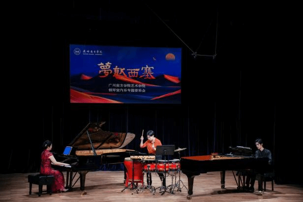 音乐会以西部地域风情与民族文化为核心创作脉络,结合导赏形式串联呈现《老腔·影子》《丝路》《花儿为什么这样红》等八首钢琴室内乐作品,演奏形式涵盖双钢琴与打击乐、钢琴独奏、协奏、四手联弹、双钢琴、钢琴与弦乐等多种组合。艺术学院钢琴教研室与室内乐青年教师们凭借精湛的专业技艺,将陕西老腔的苍劲雄浑、新疆木卡姆的灵动奔放、藏地纳木错的澄澈与神圣等西部民族的音乐特色演绎得淋漓尽致。其中,《雪莲——木卡姆的春天》通过模拟定音鼓与三角铁,再现了达普手鼓、帕萨依等新疆乐器的独特韵味,以新颖手法诠释民族音乐韵律。《青春舞曲》则以新疆民歌为动机,结合预置琴的独特设计,在改变西洋乐器音色的同时融入新疆民族旋法,实现了民族音乐基因在当代语境下的创造性转化。