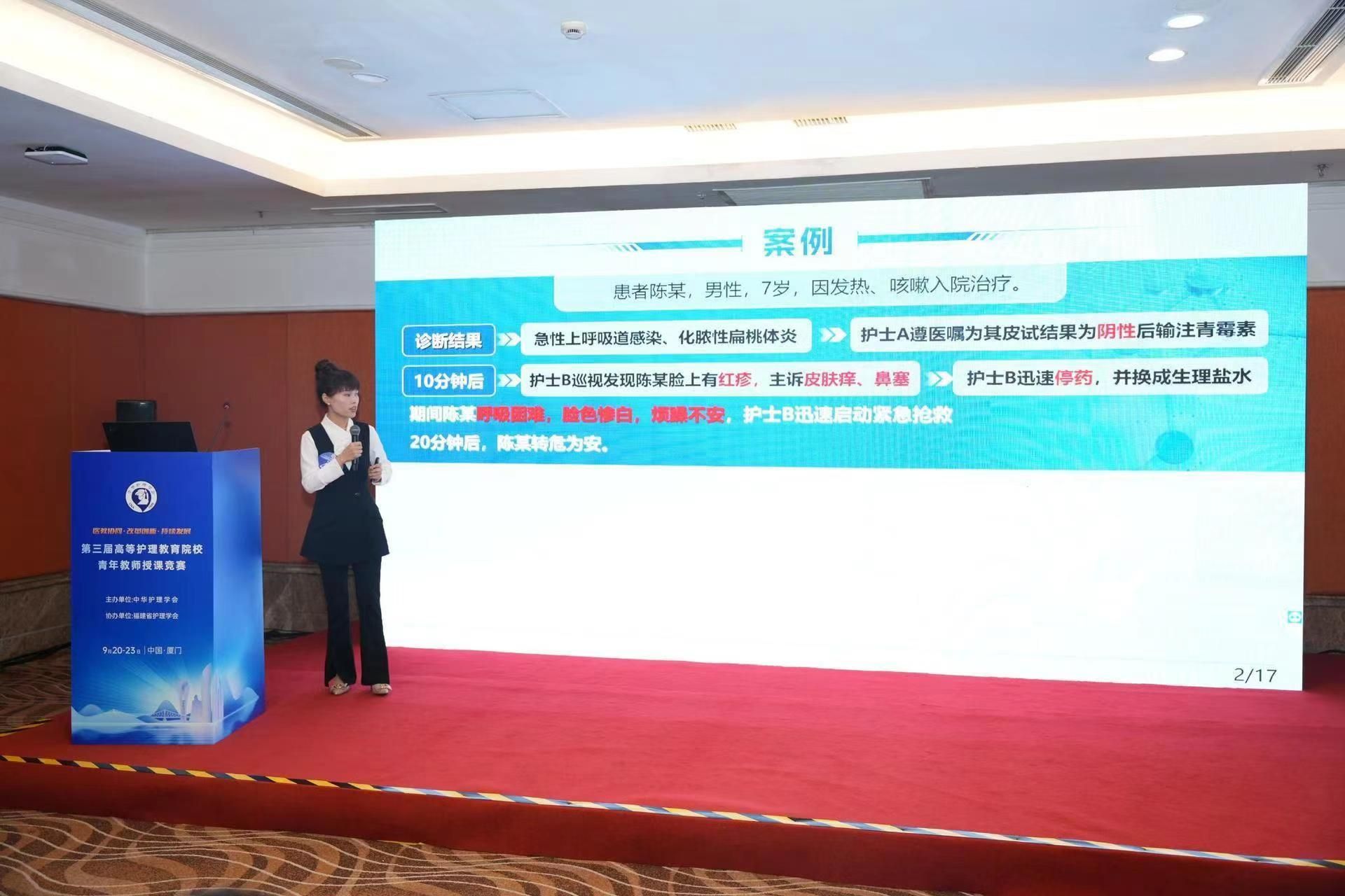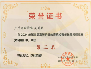 9月20日,中华护理学会第三届高等护理教育院校青年教师授课竞赛在福建省厦门市举行,beat365护理学院临床与护理学教研室主任助理吴圆荣老师获本科组第三名。