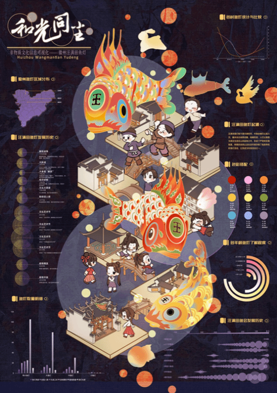 设计理念:徽州汪满田鱼灯,是安徽省非物质文化遗产,已有600多年历史,但除了本地人之外,大部分人对鱼灯文化了解较少,关注鱼灯彩艳外表,无法身临其境的体会游灯时浓郁的气氛。为了让人们真正理解鱼灯的文化价值,作品主题聚焦在正月游行路线与村民的请愿行为,强调鱼灯的传统寓意,如“鲤鱼跳龙门”。通过可视化设计,让人们深入感受节日氛围,提升文化认同感。