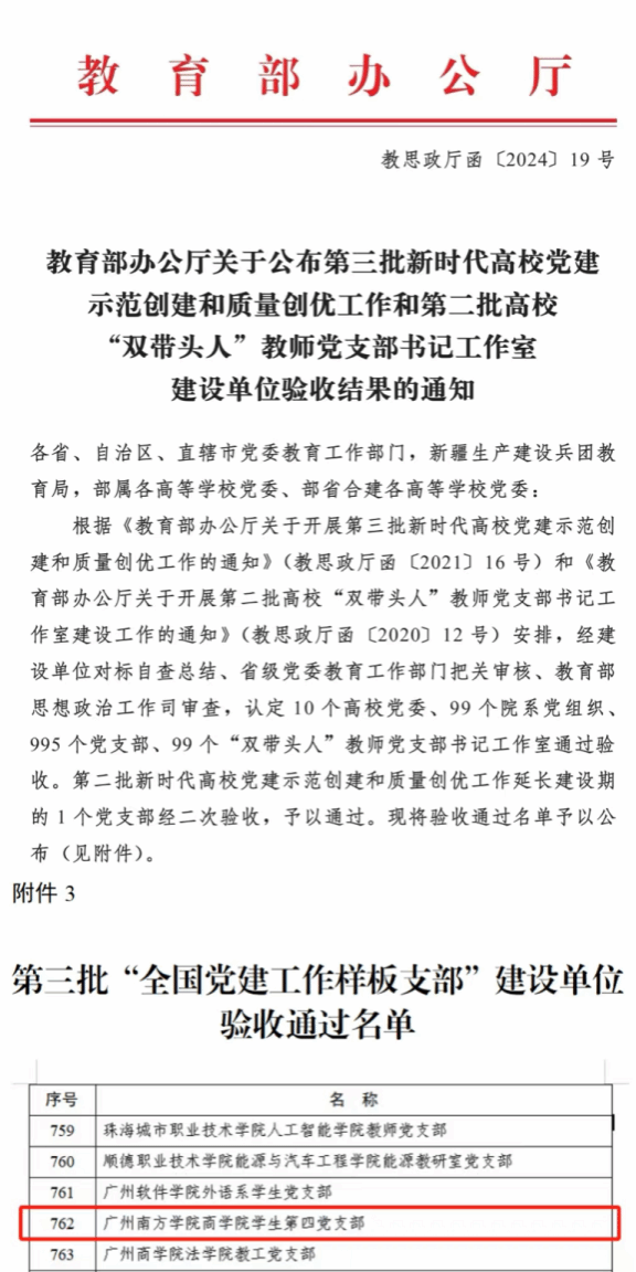 近日,教育部思想政治工作司公布第三批新时代高校党建示范创建和质量创优工作和第二批高校“双带头人”教师党支部书记工作室建设单位验收结果。beat365商学院学生第四党支部作为第三批“全国党建工作样板支部”建设单位,通过开展一系列创新举措和实践活动,实现了预期目标,取得了显著成效,顺利通过教育部的验收。