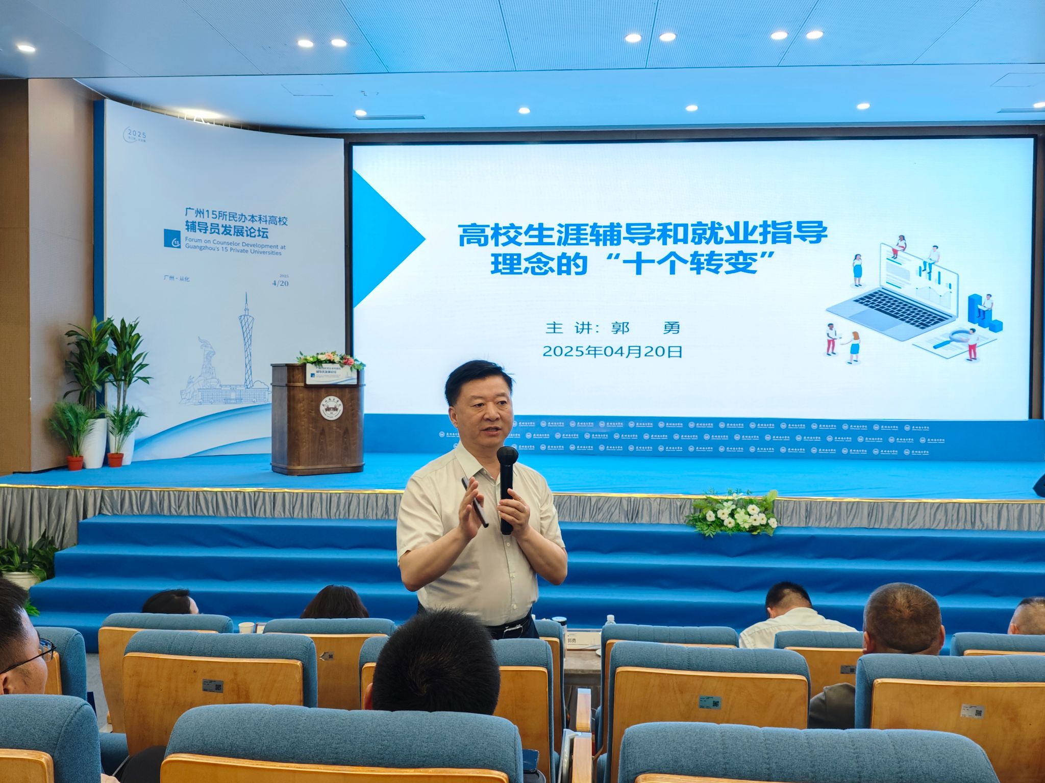 随后,本次论坛特邀嘉宾郭勇教授作专家报告。他从就业育人体系构建、就业指导和生涯辅导、就业指导路径创新以及“五位一体”生涯就业教育模型四个维度展开。他结合当代青年大学生心理特征、当下就业政策导向及高校实践的案例,重点剖析生涯教育十大理念转变,如从“就业”到“生涯”、从“适配”到“建构”,并通过大量实例,为高校就业指导工作提供新思路。最后,郭勇强调,应该以生涯教育为核心,通过多方协同机制与辅导员角色专业化升级,构建“精准化、全程化、个性化”的新时代就业育人体系。