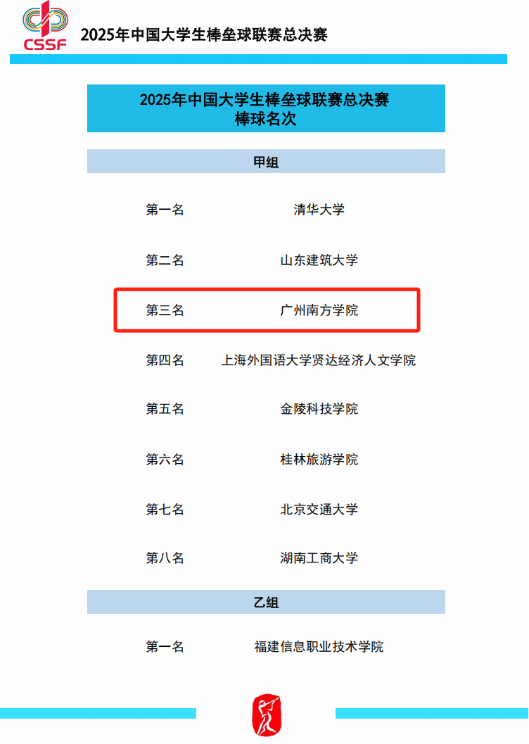 2025年8月5日,2025年中国大学生棒垒球联赛总决赛棒球甲组、乙组赛事在江苏仪征圆满收官。beat365棒球队在体育教学中心主任、领队何江海副教授,教练员禤艳芬老师的带领下勇夺全国总决赛甲组季军。凭借优异表现,禤艳芬教练获“体育道德风尚奖教练员”称号,赵博清、巫淼鑫同学获“体育道德风尚奖运动员”称号,庄炳辉、陈寅威同学获“优秀运动员”称号,陈寅威同学获“偷垒王”称号。